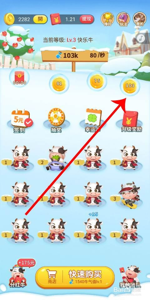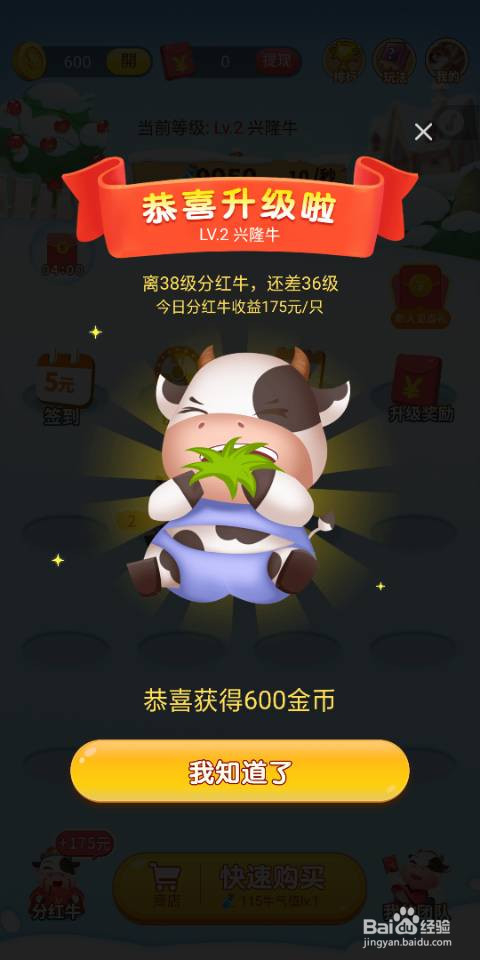 4.接着我们把牛经由过程合当作进级,可以获得大量金币
