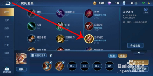 第三件装备:影刃。可以增添攻速和暴击,这样黄忠开大招就能打到敌方英雄了。如下图所示。