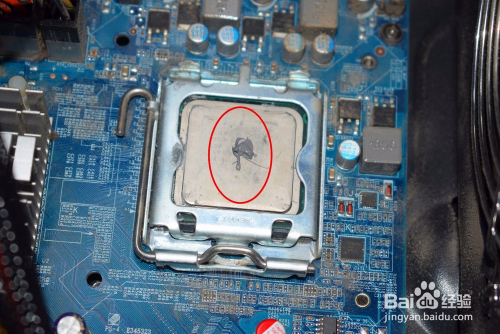 cpu上面看到硅脂干涸的陈迹,清理外表直到清晰看到cpu上面的字。