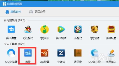 进入应用办理器页面,我们在小我东西类栏面前目今,可以看到微云,点击打开
