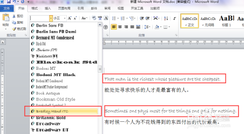 这时我们来演示一下,全选所有中英文文本,点击字体,在中文字体中随意切换,因为Word2010版本有一个预览模式,可以直接在页面上看到中文字体的不竭改变,而英文字体没有任何转变,不受到影响