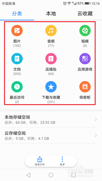 第二步进入文件办理器后,看到可以清理文件,安装包,压缩包,视频,图片等,首先点击压缩包,如下图所示: