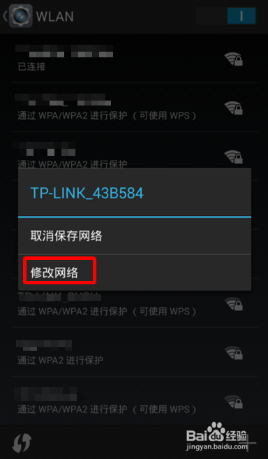 在链接的WLAN名称中,长按2秒摆布,在弹出的菜单栏中,选择点窜收集