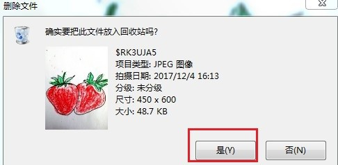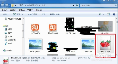 为了验证,被删除的文件是否真的被恢复成功。我们打开这个命名为“恢复“的文件夹看一下,打开后,果然,那个草莓的图片被找出来了。