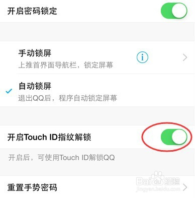手势密码设置当作功之后,系统会主动进入手势、指纹锁定的设置页面,在页面中,我们可以看到Touch ID指纹解锁今朝是出于封闭状况,滑动右侧的开关按钮,我们就可以直接利用小我的指纹密码进行解锁,不仅便利,并且加倍平安
