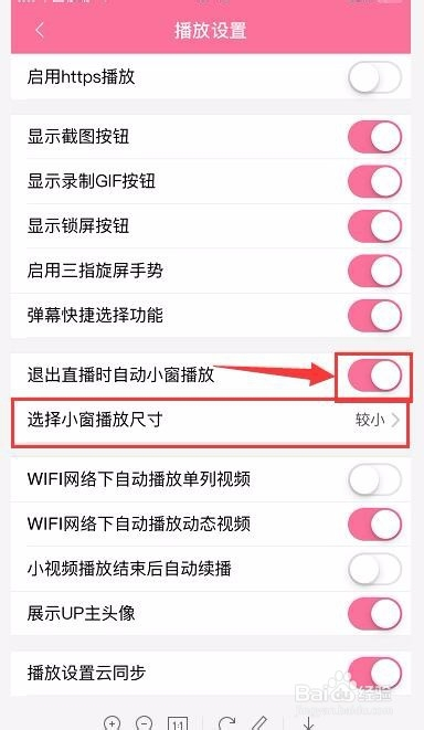 播放设置页面中,若是“退出直播时主动小窗播放”是封闭的,我们把它开启。