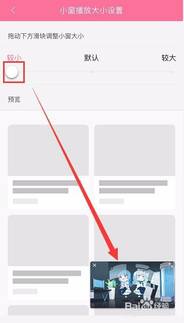 滑动小滑块在“较小、尺度和较大”中选择合适的小窗尺寸,右下角有预览模式。
