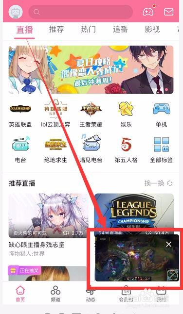 2、回到首页,点击一个直播视频进入直播视频播放页面,再点击视频左上角“返回”图标,就能看到视频在右下角小窗播放。