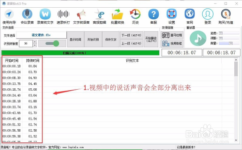 然后点击【开始识别】,接着会把说话部分,全部识别出来