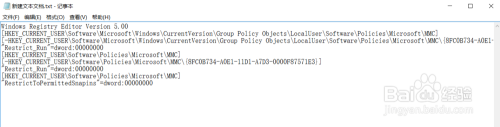 可是有的伴侣按照以上方式却找不到MMC,这时我们就要新建一个文本文档了,然后将以下内容复制到记事本Windows Registry Editor Version 5.00[HKEY_CURRENT_USER\Software\Microsoft\Windows\CurrentVersion\Group Policy Objects\LocalUser\Software\Policies\Microsoft\MMC][-HKEY_CURRENT_USER\Software\Microsoft\Windows\CurrentVersion\Group Policy Objects\LocalUser\Software\Policies\Microsoft\MMC\{8FC0B734-A0E1-11D1-A7D3-0000F87571E3}]"Restrict_Run"=dword:00000000[HKEY_CURRENT_USER\Software\Policies\Microsoft\MMC][-HKEY_CURRENT_USER\Software\Policies\Microsoft\MMC\{8FC0B734-A0E1-11D1-A7D3-0000F87571E3}]"Restrict_Run"=dword:00000000[HKEY_CURRENT_USER\Software\Policies\Microsoft\MMC]"RestrictToPermittedSnapins"=dword:00000000;
