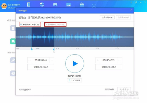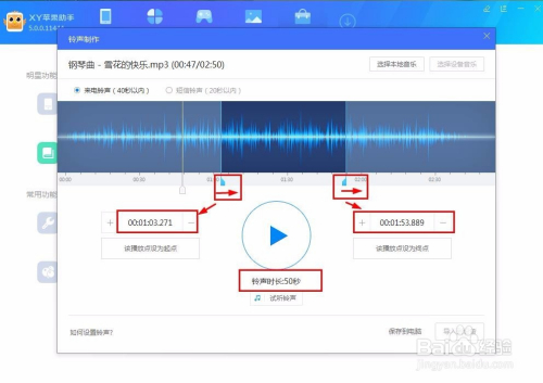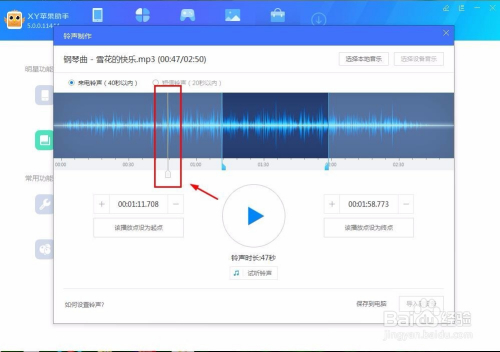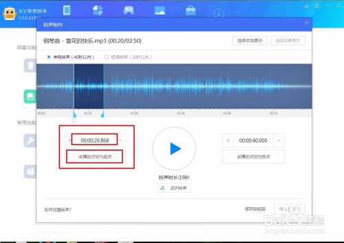 在界面有个白色的竖条,这是播放音乐时音乐正在播放的位置标杆,这也是为了我们识别音乐处在什么位置,我们点击播放按钮,到想要设置铃声起点的位置点下暂停,然后选择该播放点设为起点,接着点播放,到想要铃声的结从头至尾点下暂停键,然后设置该播放点设为终点,如图: