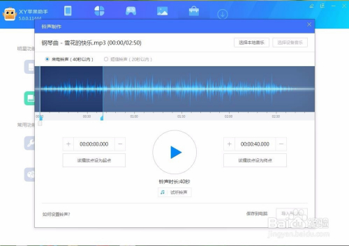 选择打开当地音乐之后,就会弹出选择音乐的窗口,我们找到我们要建造铃声的音乐地点的文件位置,这里我随便选了首钢琴曲,然后打开它。打开之后就进入了铃声的建造界面,如图: