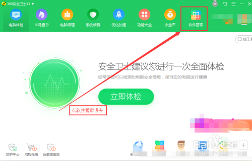 打开360卫士选择软件管家进去,如下图所示操作