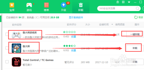 显示系统所有安装的软件,比如卸载鲁大师游戏库,点右边 的一键卸载按钮进行卸载