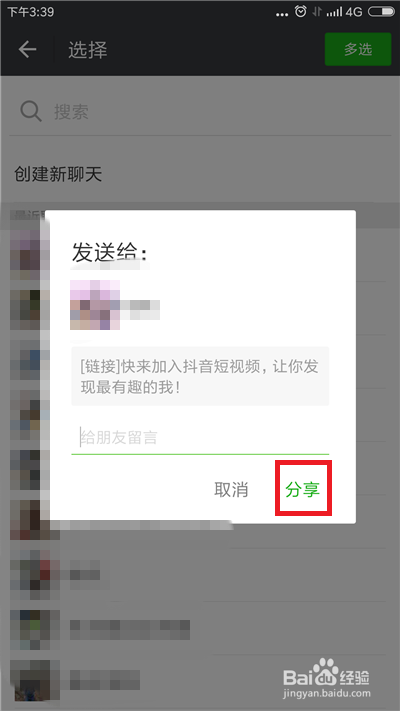 接下来的界面会呈现发送邀请给微信老友,点击【分享】,也可以写下留言。