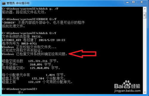 点击后进入的是号令提醒符窗口,在号令窗口中输入【chkdsk G:/f】并点击回车键。