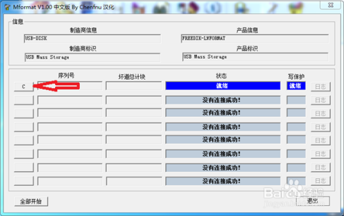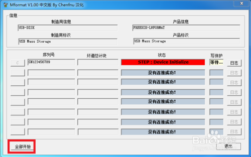点击后会在状况中显示信息,接着点击左下角的【全数起头】就可以修复U盘了。