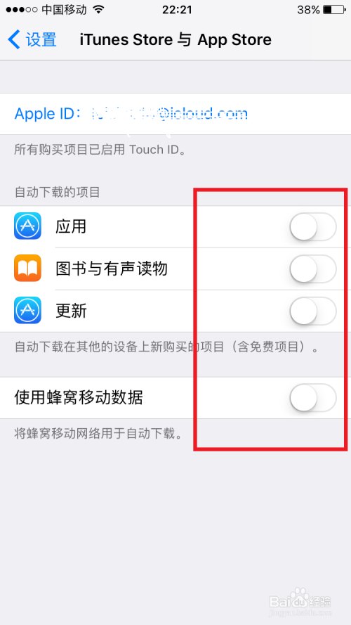 接着打开设置里边的itunes store的选项,在弹出来的设置界面,把下面主动下载的项目后边的开关全数封闭。