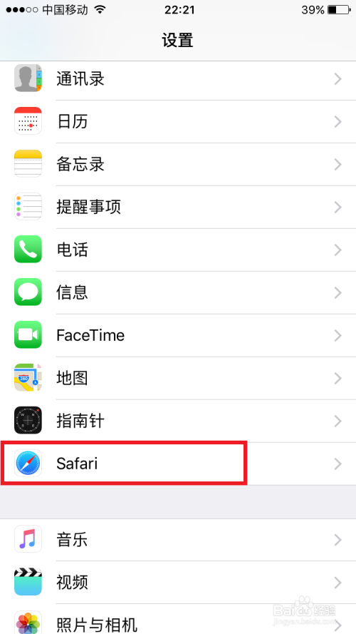 打开iPhone苹果手机的界面,选择设置选项,然后在设置选项里选择safari选项,其实也是苹果手机自带的浏览器,如图所示: