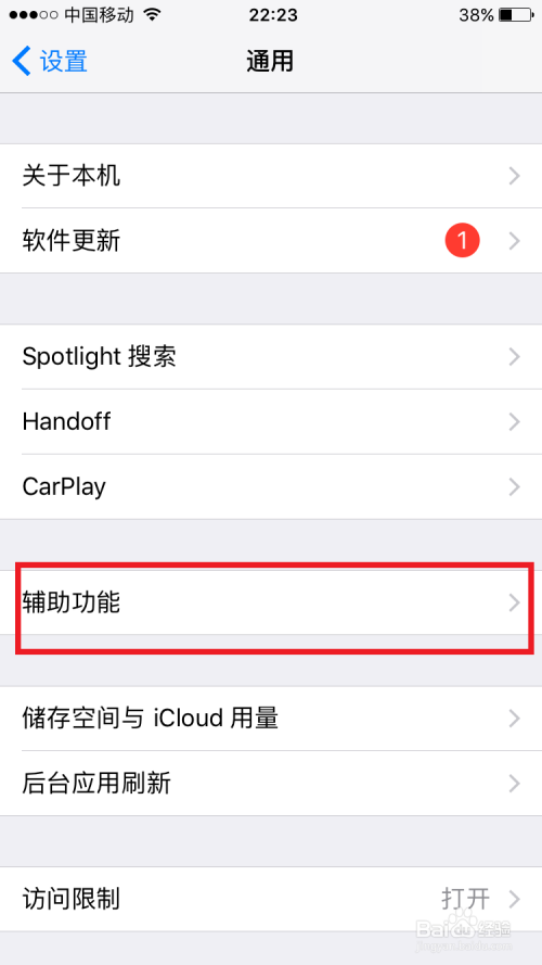 接着打开设置界面的通用选项,进入通用的设置界面,选择辅助功能选项,如图所示: