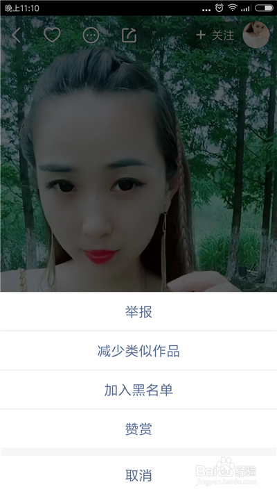 在弹出的界面中只能看到【举报】、【插手黑名单】和【赞赏】等选项,并没有【一路同框拍】的功能,一路同框拍的方式就是在这里点击的,然而并没有。