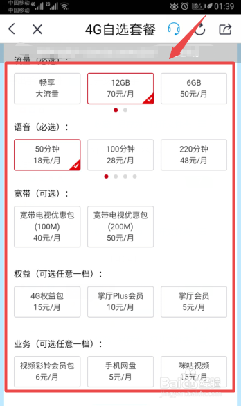 然后点击4G自选套餐;
