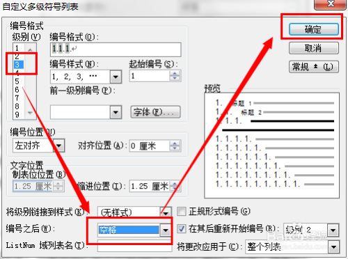 自界说多级符号列表中,级别选择3,其他方式亦然,点击确定退出即可