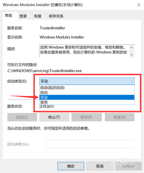 进入界面,我们细心不雅察。找到启动类型。鼠标点击下拉菜单。点击手动。