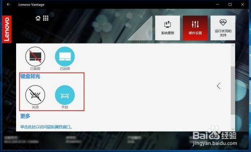 进入到对应的界面,可以看到键盘背光的选项,下边就有有个开关图标,打开键盘灯就点击开启,关头盘灯就点击封闭。