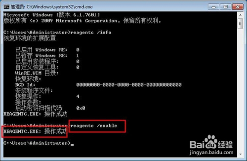 接下来输入启用的号令,输入reagentc /enable,然后按回车键,界面下方就会显示操作当作功的标识。