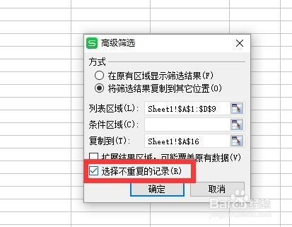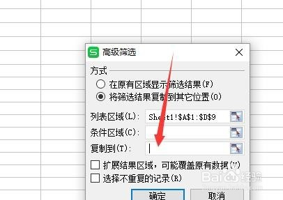 然后进入高级删选的弹框,在高级删选弹框中选将筛选的成果复制到其他位置,然后光标放到“复制到”