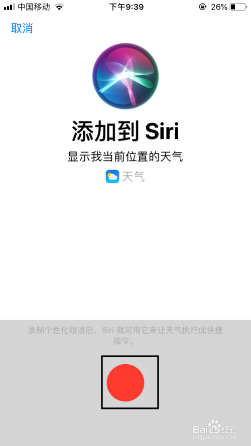 然后有个提醒页面添加到Siri的功能下在页面中点击“灌音”按钮。