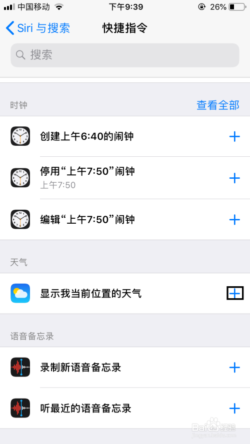 1、点击“Siri与搜刮”选项,点击“所有快捷指令”选项,找到要设置快捷指令,这里以气候为例,找到显示我当前位置的气候选项中点击“+”号按钮;