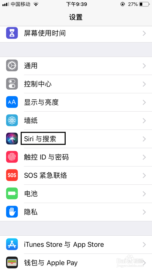 首先打开设置页面中选择点击“Siri与搜刮”选项。