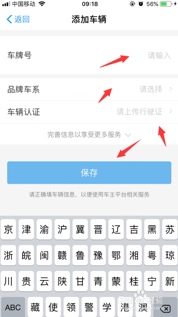 输入爱车的车商标,品牌车系及行驶证,点击“保留”。