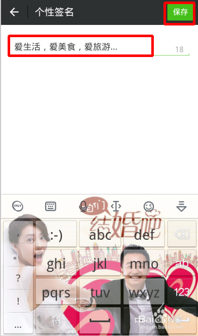 填写最长不跨越30字符的个性签名,输入完毕之后,点击右上角的保留按钮