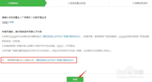 进入和谈阅读页面,这时需要您当真阅读和谈,而且查对当前流量本家儿开通本家儿体是否准确,若是都没有什么问题的话,直接勾选下方的“我赞成并遵守以上条条目以及《微信腾讯公家平台告白展示办事和谈》”,然后点击下方的“赞成”,进入下一步调