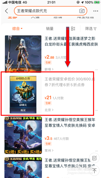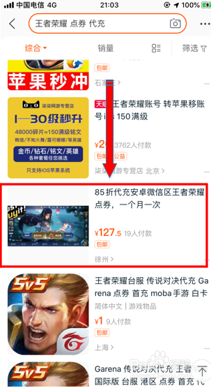 3.点搜刮后,可看到有良多商铺所示王者荣耀充值价钱以及扣头,寻找65折的。