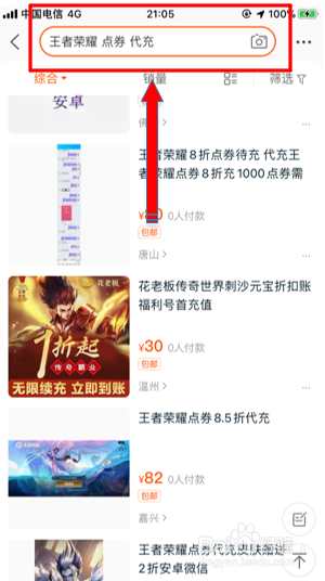 步调二:在淘宝上方搜刮栏,输入“王者荣耀 点卷 代充”然后搜刮。
