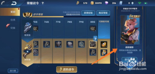 然后把进阶版的荣耀战令进级到80级,领取战令限制皮肤阿轲-迷踪丽影。