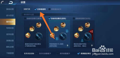找到操作设置界面顶部设置方案一栏,勾选‘全英雄通用’即可。
