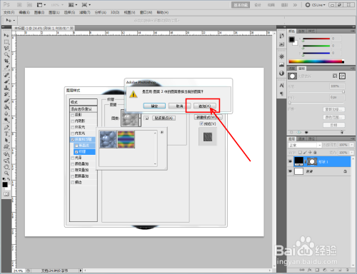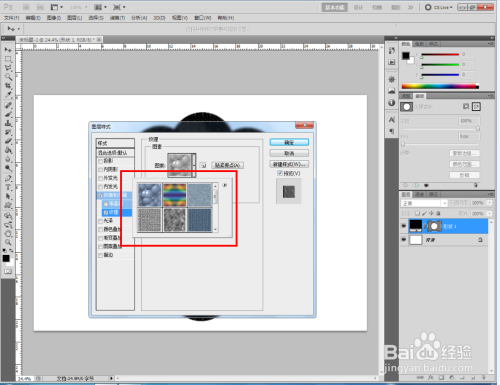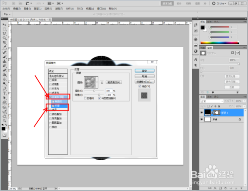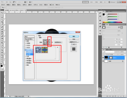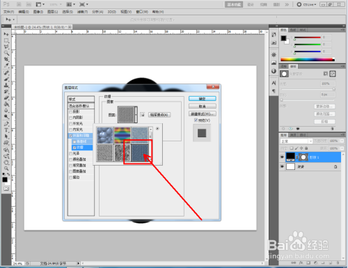 双击图示自界说图案图层,弹出图层样式设置栏。勾选【斜面和浮雕】-【纹理】,点击图示小三角,弹出图案选项栏;