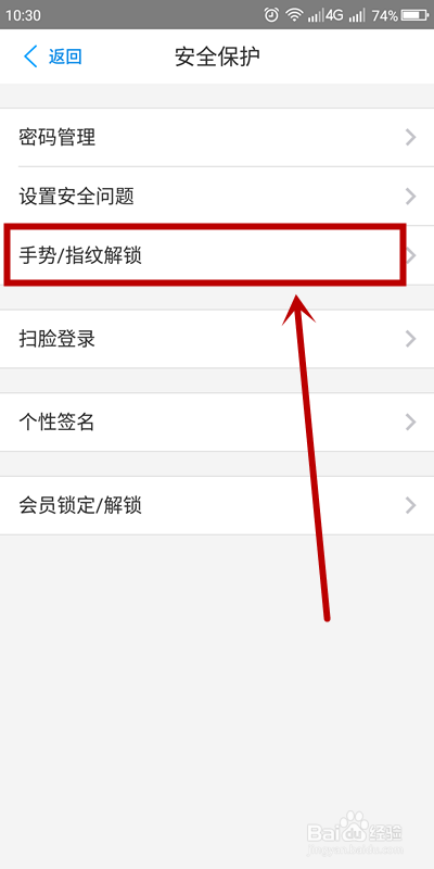 进入【平安庇护】页面后,单击【手势/指纹解锁】选项