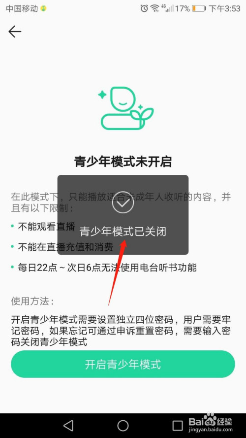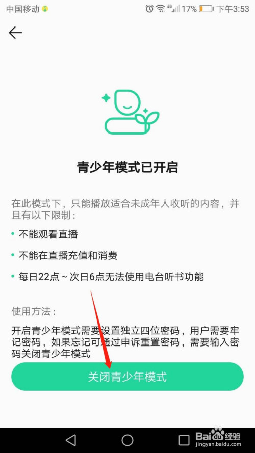 青少年模式已开启,点击页面下方“封闭青少年模式”按钮。