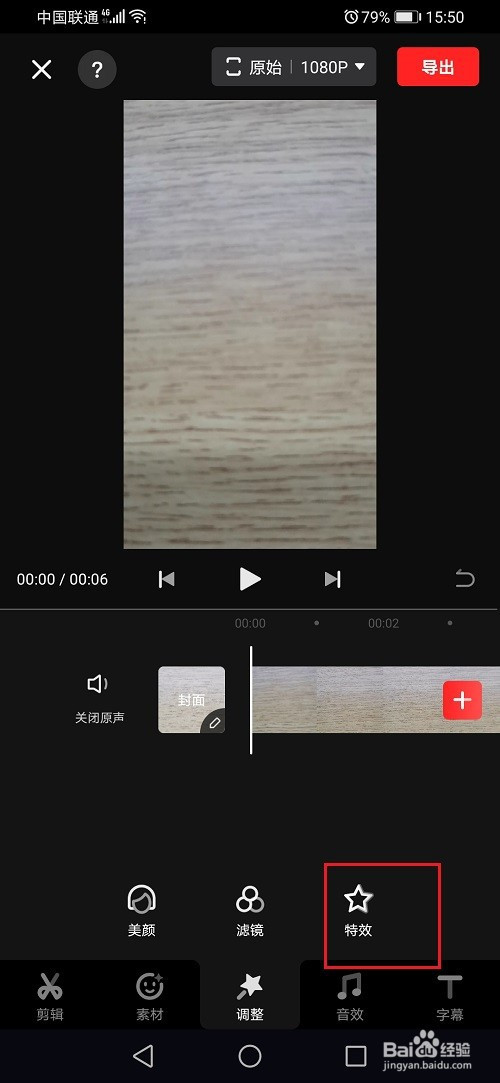 第四步进去快影调整界面之后,点击特效,如下图所示: