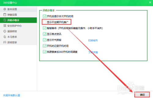 不选择“显示不按期开机推广”,点击“确定”,如下图所示