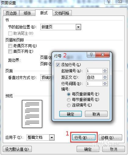 然后在弹出的“页面设置”窗口中,点击最下方的“行号”,然后在“行号”窗口中设置肇端编号和行号间距,一般选择默认即可知足要求。