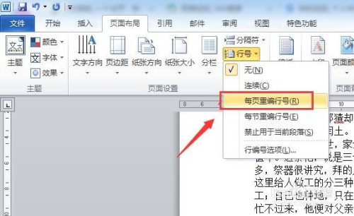 在“页面结构”的“页面设置”板块,找到“行号”,点击一下旁边的小三角形,之后会呈现各类行号的设置体例,默认是“无”,也就是没有行号设置,这里我们选择“每页重编行号”。