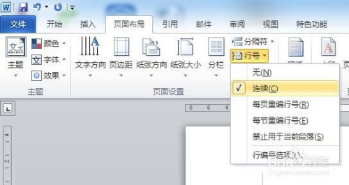 在“页面结构”的“页面设置”板块,找到“行号”,点击一下旁边的小三角形,之后会呈现各类行号的设置体例,默认是“无”,也就是没有行号设置,这里我们选择“持续”。