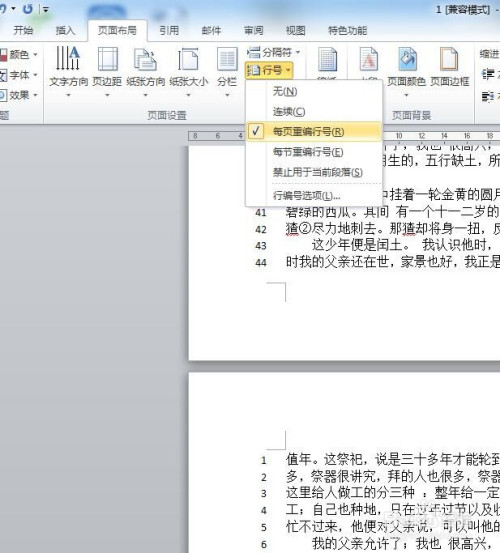 若是但愿每页都进行从头的编行号也是可以的,可以在行号中设置为“每页重编行号”即可。